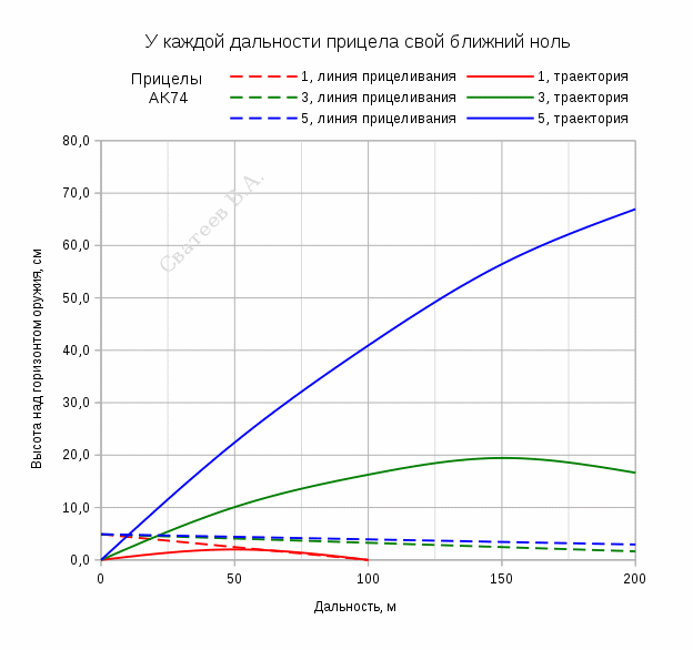 У любого оружия чем больше метка дальности установлена на прицеле, тем круче траектория и она раньше пересекает линию прицеливания. А чем меньше метка прицела, тем дальше ближний ноль. Пример для АК74 на Рис.6.
