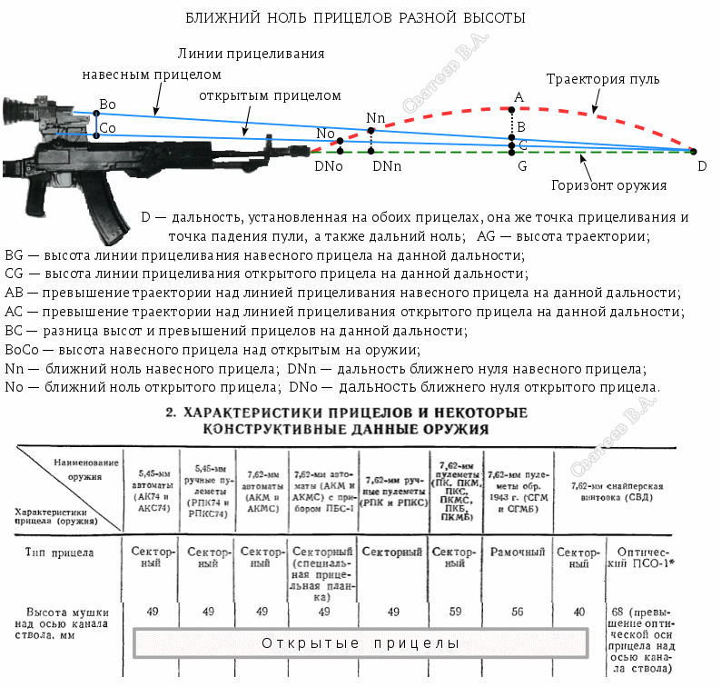 Обнулять другое оружие и навесные прицелы? Но понял ли автор Пособия, что у каждой модели оружия свой ближний ноль и это вызовет вал проблем? Сомнительно, ведь в Канале "КОП" остался термин не "ближний ноль", а некий "заданный ближний ноль", а в Пособии - "отсутствие превышения траектории в заданной точке". Так понял ли автор Пособия, что дальность ближнего нуля задать невозможно, она диктуется траекторией и линией прицеливания и у каждой модели оружия и каждой Высоты установки навесного прицела - своя?!
