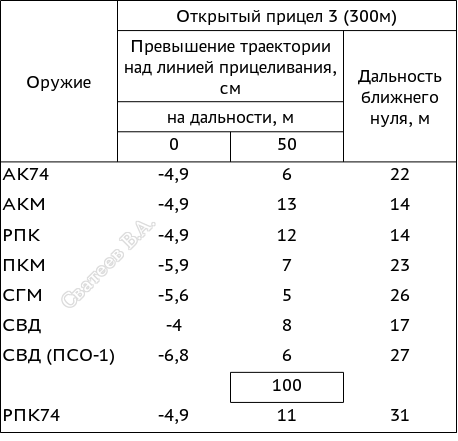 Как видим, даже с одинаковой меткой 3 открытого прицела у различного оружия дальность ближнего нуля различается более чем в 2 раза - от 14 до 31 м. И это ещё без укороченного оружия, без 12,7-мм оружия, без ВСС, Вал и т.п.