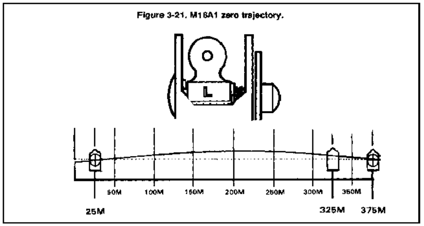 Первую винтовку М16А1 американцы начали обнулять на дальности 25 м, где ближний ноль её метки L (375 м) - Рис.11 из мануала [5]. Отмечу, что метка 375 м не случайна, это дальность прямого выстрела М16А1 по головной фигуре. Такой метки не хватает нашему оружию.