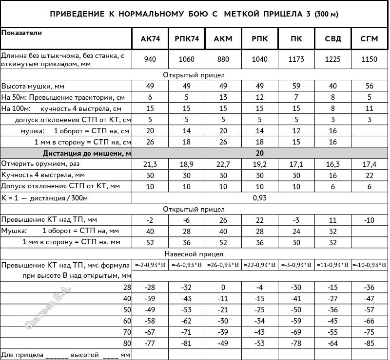 Нормативы кучности и точности боя оружия, а также перемещения СТП при корректировке прицела необходимо уменьшить пропорционально уменьшению дальности. Поскольку у каждого оружия своя дальность ближнего нуля открытого прицела, а у навесных прицелов может быть 3 и более Высоты установки над открытым, то для каждого оружия необходимо пересчитать все нормативы для каждой из 4-х дальностей ближнего нуля. А поскольку рота обычно имеет 4 типа стрелкового оружия - АК74, РПК74, ПК, СВД -, то необходим талмуд из 16 наборов нормативов для всех дальностей ближнего нуля оружия роты.