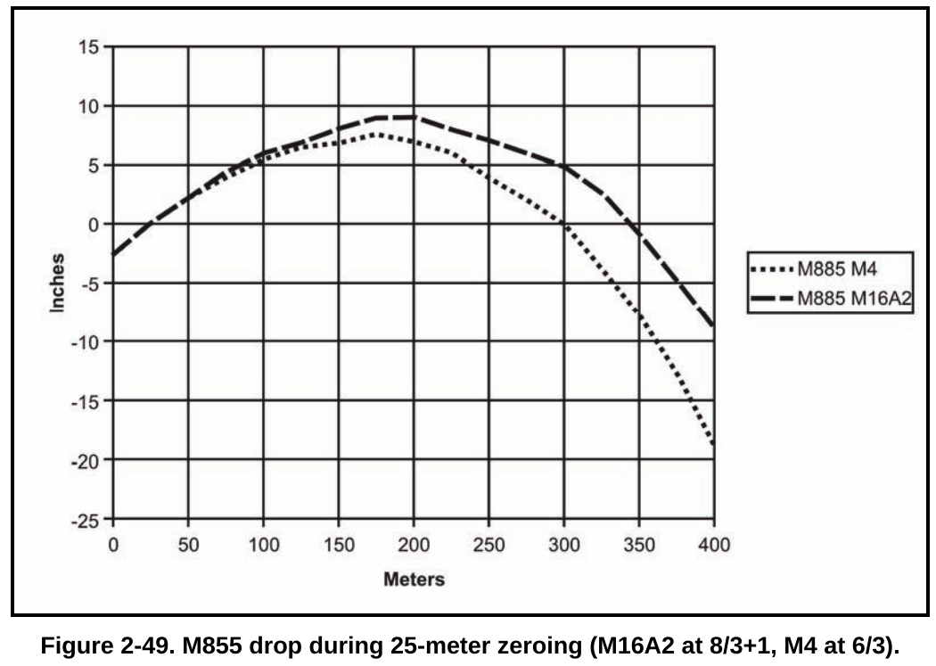 Открытые прицелы (iron sight - "металлический прицел") М16А2/А3/А4 и М4 обнуляют не с метки 375 м, а с такой, ближний ноль которой у данного оружия находится на дальности 25 м. Читаем Рис.12, где метка "8/3" или "6/3" - это 800 или 600 м когда маховик дальности прокрутили на 1 оборот вверх, или 300 м, когда маховик прокрутили на 1 оборот вниз: