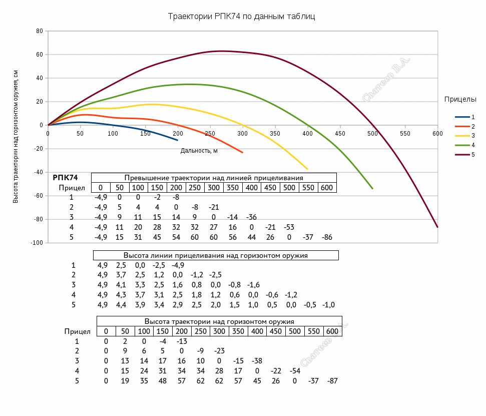 К тому же, для метки 2 РПК74 Превышение на дальности 50 м указано больше, чем на дальности 100 м. Но тогда вершина траектории 2 должна быть ближе 100 м, то есть ближе середины траектории. А по всем законам физики вершина находится несколько дальше середины, то есть дальше 100 м, что и указано в Основной таблице - Рис.7.