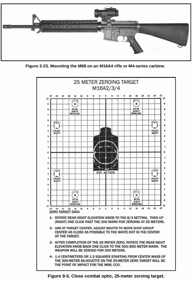 - Превышение установленного на небольшой Высоте close combat optic М68 (коллиматорный прицел) составляет 1,5 клетки ниже точки прицеливания (центра фигуры) - Рис.10 из мануала [3], порядок обнуления открытого прицела описан в п.п. 1-3, а М68 - в п. 4;
